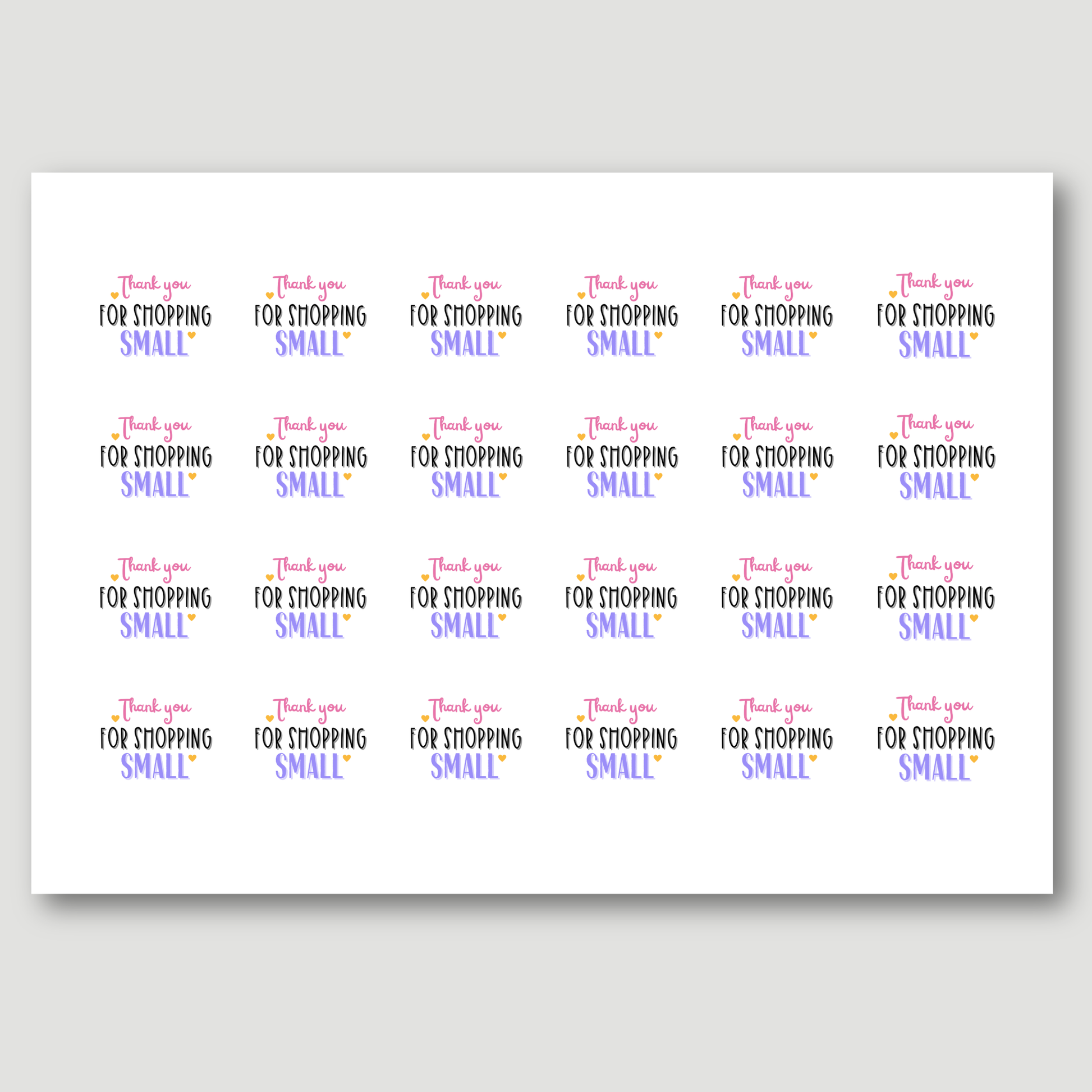 Show your appreciation with these “Thank You for Shopping Small” stickers, the perfect finishing touch for your orders. Ideal for small businesses, they add a thoughtful and heartfelt message to your packaging while making your customers feel valued. Cute and eye-catching, they’re perfect for sealing parcels, boxes, or tissue paper and leaving a lasting impression.